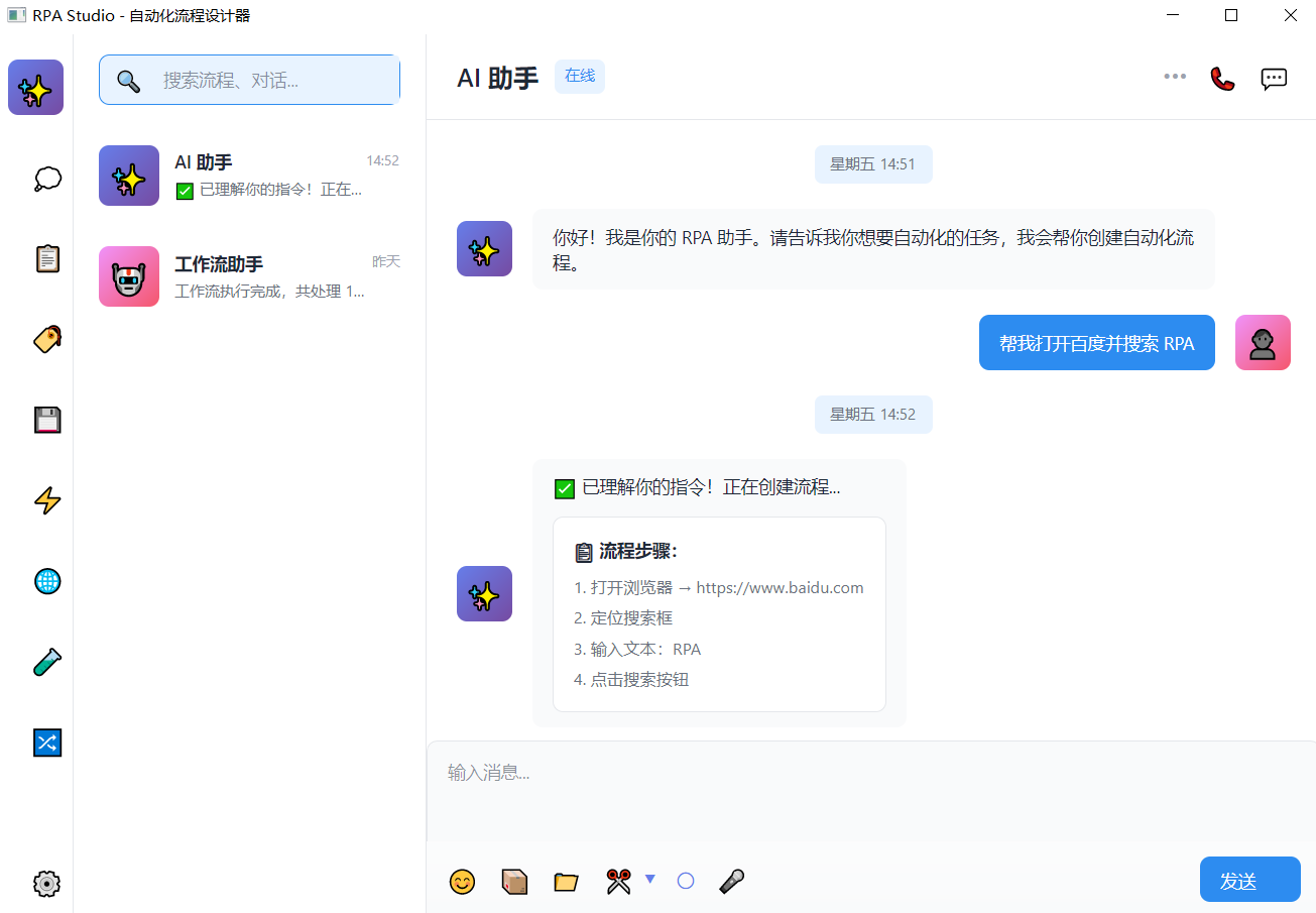 AI RPA 助手是RPA Studio 自动化流程设计器内置的智能对话式自动化工具,是融合了 AI 大模型与 RPA(机器人流程自动化)技术的「智能数字员工」。